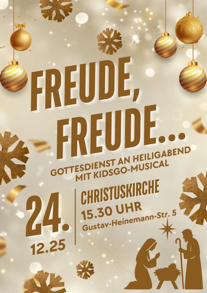 Herzliche Einladung zum Heiligabend-Familiengottesdienst um 15:30 Uhr in der Christuskirche Neu-Anspach. Wir freuen uns auf das KidGo-Musical, das uns mit hineinnimmt in die Freude an Jesu Geburt.